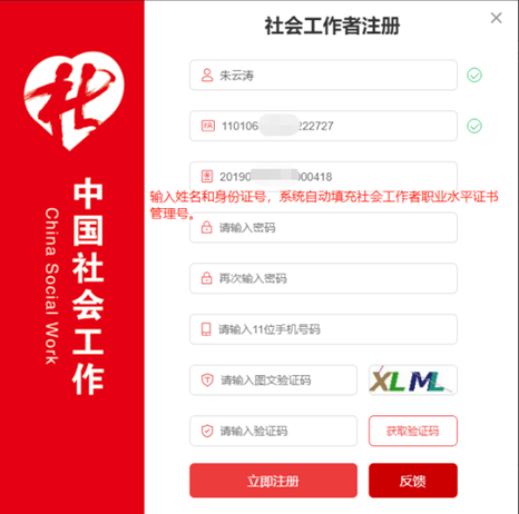 ②进入社会工作者账户注册页面,填写注册信息。输入姓名和身份证号,系统后台自动验证,验证通过,自动填充社会工作者职业水平证书管理号,无需社工手动填写。